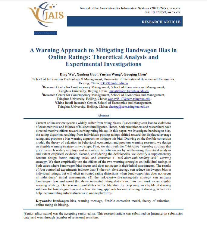 Wu, D., Guo, X., Wang, Y., & Chen, G. (2023). A Warning Approach to Mitigating Bandwagon Bias in Online Ratings: Theoretical Analysis and Experimental Investigations. Journal of the Association for Information Systems, Forthcoming.