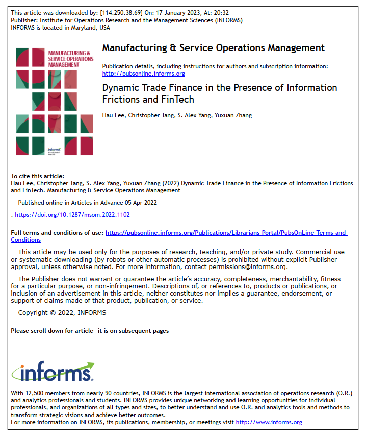 Hau L. Lee, Christopher Tang, S. Alex Yang, Yuxuan Zhang*(通讯作者). "Dynamic Trade Finance in the Presence of Information Frictions and FinTech." Manufacturing & Service Operations Management (2022). Available at: //doi.org/10.1287/msom.2022.1102. (UTD24, 外经贸国际A类期刊)