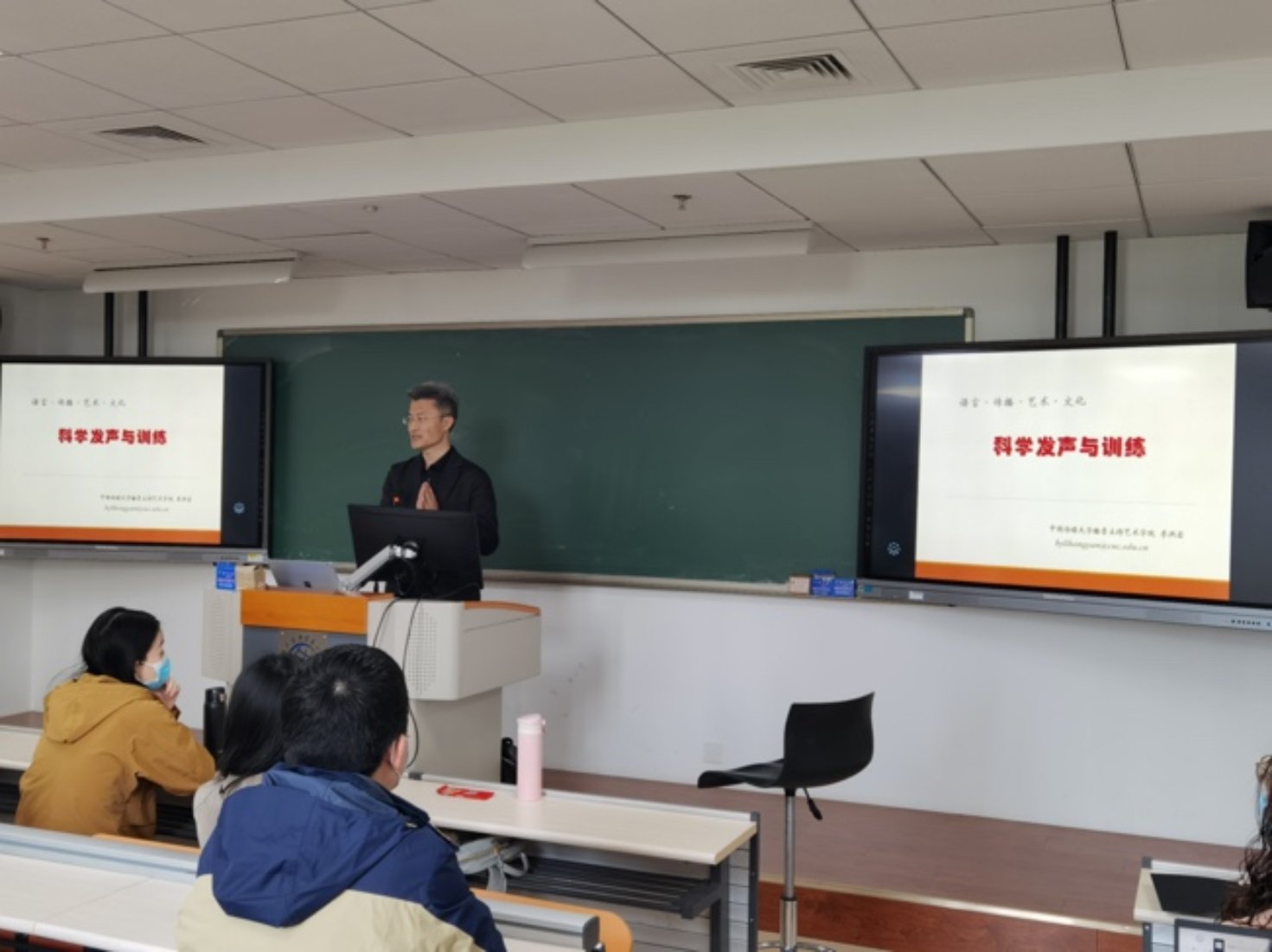 本次活动李教授从科学发声的重要性、教师用嗓的常用问题、科学用嗓的基本方法三个方面进行分享。活动开始李教授结合自身职业的情况,说明了科学用嗓的重要性,懂得科学用嗓,教师才能轻松授课。