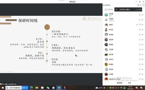 (水果派解说 21级入党积极分子宋柯颖讯)2023年5月9日晚上8:30,为了推动学习贯彻习近平新时代中国特色社会主义思想主题教育深入开展,把学习和实践有机地融合起来,发挥党员力量,办好群众满意的“实事好事”,水果派解说 2019级党员同志为2021级开展“一对多”经验分享活动。本次活动邀请到了两位来自2019级的党员同志——杨懿凡(已保研至中国人民大学)、杨璐(帝国理工大学深造)为2021级的支部成员做学业规划的经验分享,有针对性地解决同学们在未来规划中可能会遇到的问题和疑惑,充分起到“朋辈引领”的作用。本次分享会由邓皓谦同学主持,以线上会议的方式进行。