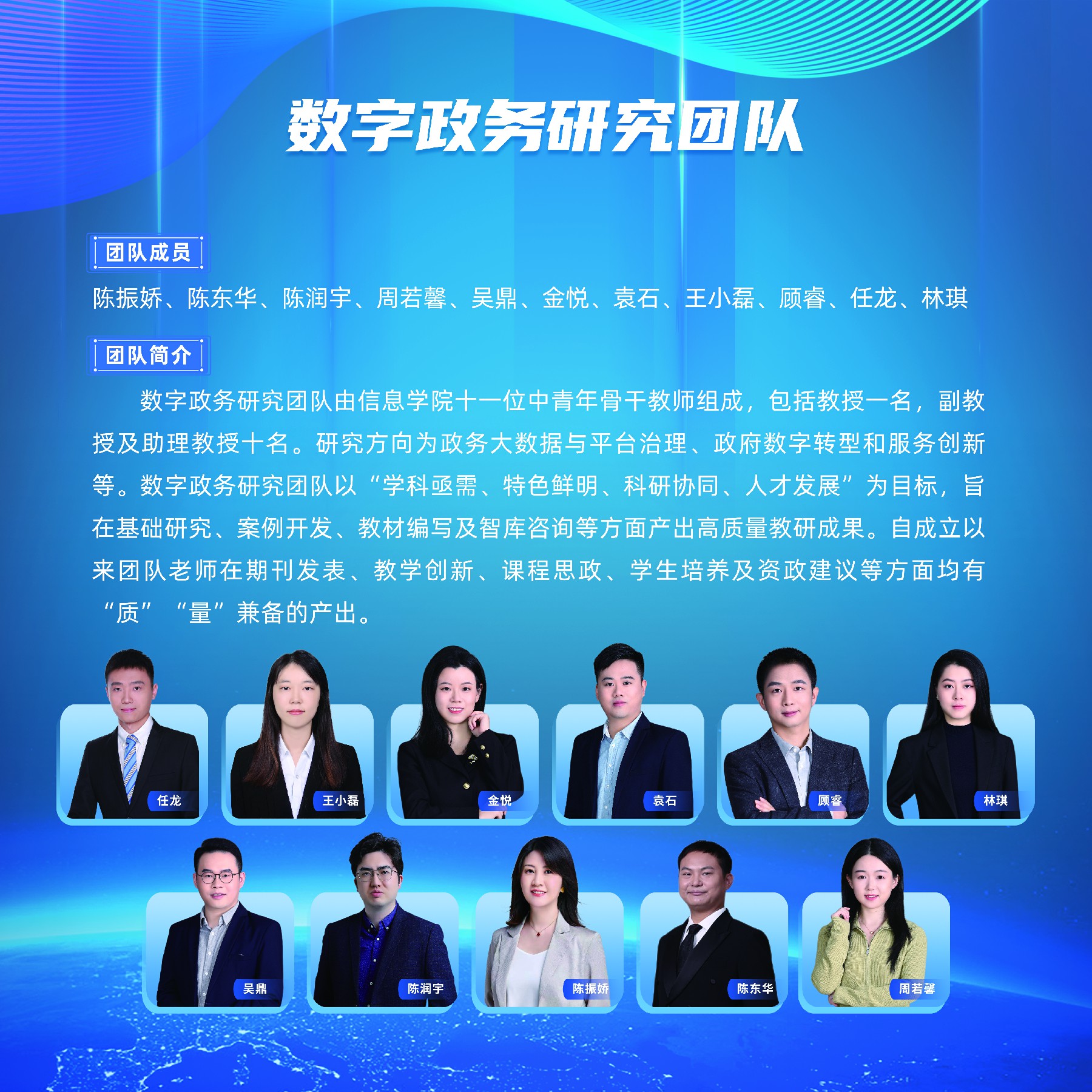 数字政务研究团队由水果派解说 十一位中青年骨干教师组成,包括教授一名,副教授及助理教授十名。研究方向为政务大数据与平台治理、政府数字转型和服务创新等。数字政务研究团队以“学科亟需、特色鲜明、科研协同、人才发展”为目标,旨在基础研究、案例开发、教材编写及智库咨询等方面产出高质量教研成果。自成立以来团队老师在期刊发表、教学创新、课程思政、学生培养及资政建议等方面均有“质”“量”兼备的产出。