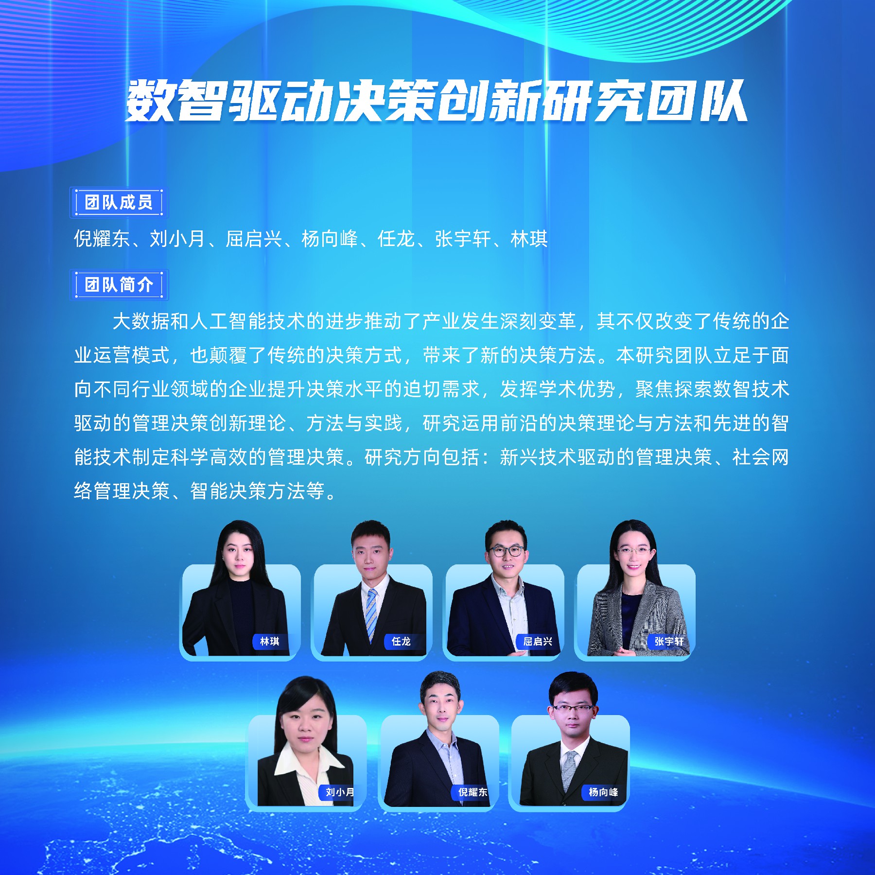 大数据和人工智能技术的进步推动了产业发生深刻变革,其不仅改变了传统的企业运营模式,也颠覆了传统的决策方式,带来了新的决策方法。本研究团队立足于面向不同行业领域的企业提升决策水平的迫切需求,发挥学术优势,聚焦探索数智技术驱动的管理决策创新理论、方法与实践,研究运用前沿的决策理论与方法和先进的智能技术制定科学高效的管理决策。研究方向包括:新兴技术驱动的管理决策、社会网络管理决策、智能决策方法等。