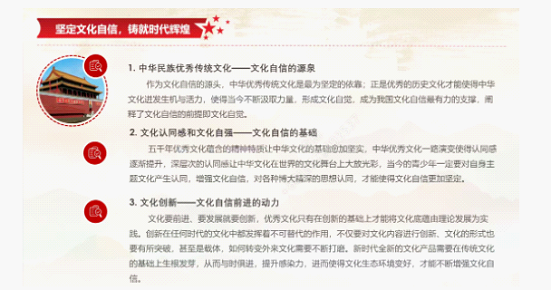 在第四部分,代秋玲同志讲述了培养文化自信的方法与途径。作为新时代青年,首先我们要增强文化认知,实现核心价值观日常生活化,年轻一代要坚定自己的信仰,在行动中主动发挥社会主义意识形态的作用。其次,我们要推广文化活动,充分发挥主流媒体传播作用,建设传统文化主题园区。同时,我们还要推动文化创新,从优秀文化中寻找源头活水。最后,我们要加强中外文明交流互鉴,让世界听到中国声音。