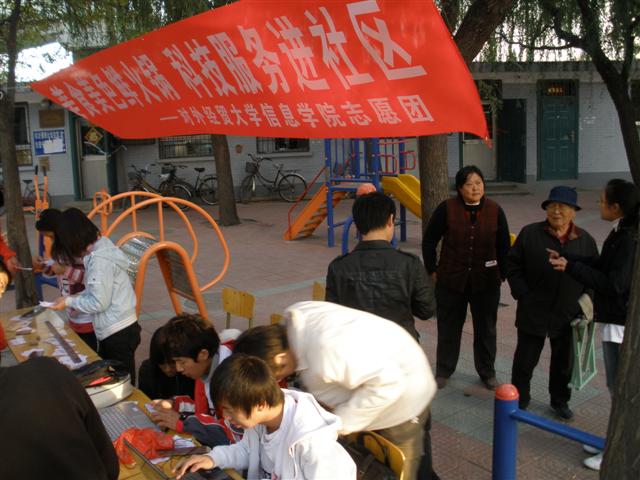 青年志愿者服务团与计算机网络协会联合举办了“信息科技走进社区”的志愿服务活动。这次活动旨在为普通居民提供科技基础知识的教育,使现代科技深入基层群众,加快科技现代化进程,同时提高学院学生专业知识的实践应用能力。 冬天已至,但志愿者们的热情丝毫不减,他们顶着寒风来到芍药居小区,为居民们义务讲解计算机、上网的一些知识及家电使用常识。同学们的服务立刻受到小区居委会的热烈欢迎,并为同学们提供了桌子、椅子等必要工具设备,同时也为志愿者提供了室内讲解场所。