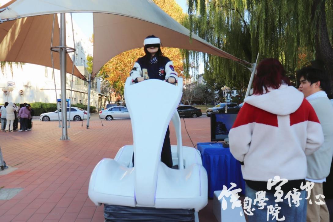 在AI绘画旁边,VR科技展品也吸引了很多同学的目光,同学们纷纷跃跃欲试,渴望体验一番。此次展品是VR滑雪机,身临其境的视觉效果使得同学们无需亲身前往,也能够体验到滑雪的乐趣。