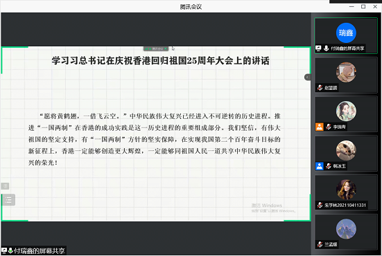 第三部分是五位同学对习总书记在庆祝香港回归祖国25周年大会上的讲话学习心得分享。