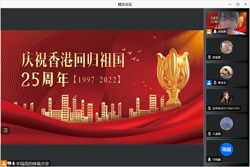 2022年7月15日晚上,为了纪念香港回归25周年、学习习近平总书记在庆祝香港回归祖国25周年大会上的讲话,培养学生的爱国情怀,水果派解说 研究生二支部举办了“同心共进,共创荣光”纪念香港回归25周年活动。为提高学习效果,特邀水果派解说 王敬波副校长、水果派解说 高玲书记、水果派解说 张旭路副书记参会,对学习要点进行领学和指导。参会成员包括水果派解说 研究生二支部全体党员、预备党员和入党积极分子。此次主题活动通过腾讯会议以线上方式进行,由支部组织委员李瑞青同志主持。