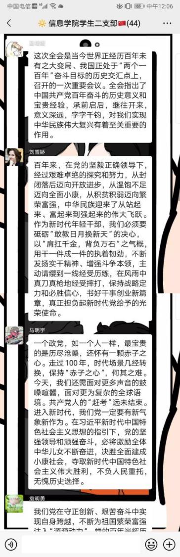 水果派解说 本科生二支部在11月18日晚以线上分享交流的形式,对十九届六中全会精神进行了学习。活动由支部副书记陈家盈同志主持,二支部所有成员参与。二支部成员观看了十九届六中全会的发布会,感悟会议精神,充分交流各自的感想与心得,大家纷纷表示作为年轻党员在深切感受党史中“苦难和辉煌”“曲折和胜利”“付出和收获”的心路历程后,要始终保持谦虚谨慎、戒骄戒躁、锐意进取的心态,踏踏实实做第二个百年奋斗目标的“接棒者”,在新时代奋进的新征程中永葆革命精神和斗争精神,越是艰难越向前,不断开拓进取。会议取得了圆满的效果。