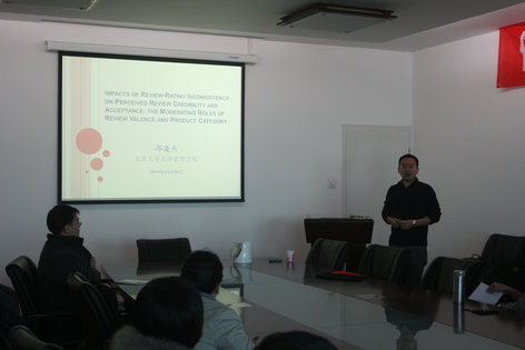 “新兴电子商务参与者行为规律学术创新团队”在博学楼1415会议室举办学术讲座。本次讲座特别邀请北京大学光华管理学院管理科学与信息系统系助理教授邱凌云作题为“Impacts of Review-Rating Inconsistency on Perceived Review Credibility and Acceptance: the Moderating Roles of Review Valence and Product Category”的学术报告。讲座由“新兴电子商务参与者行为规律学术创新团队”倪耀东老师主持,学院部分教师和学生参加了此次讲座。