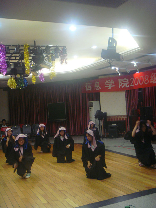 一段双人爵士舞宣告晚会正式开始,而接下来一个传统的游戏抢椅子很好地活跃了场上的气氛。“十佳歌手”王雯的出现掀起了一阵小高潮,而她为大家带来的动感十足的歌曲《套马杆》引爆全场大合唱,气氛high到极点。游戏“我爱记歌词”:每班派出一名代表,在播放完前奏之前进行抢唱,抢唱时还需戴上播放着强烈干扰音乐的耳机唱出正确歌词。说是“记歌词”,但其关键之处却在于一个“抢”字。没麦克风就算你知道是什么歌也只能在那儿眼红干着急。于是,无辜的话筒就被一群疯狂的麦霸肆意蹂躏。因为耳机里音乐干扰,大家唱出来的歌曲也是五花八门。走调是必须的,而什么颤音、吞词也是层出不穷,甚至逼急了也不管什么调子了,直接来段说唱。台上受苦受难的参与者的辛酸没有白费,在座的观众从游戏一开始到结束笑声就没停过。