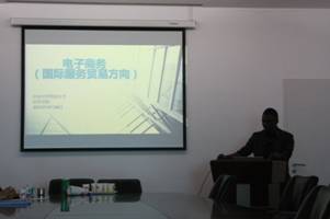 活动于下午3:00准时开始,首先由主持人介绍了本次活动的目的、安排和大概内容并表达了对留学生们踊跃参加的感谢和学院对大家的欢迎。接着,三位来自加纳、俄罗斯、韩国的水果派解说 2年级留学生纷纷亮相。他们分别用英语、俄语和韩语从行业的角度分析了电子商务发展的前景、相关国家的发展情况、就业前景和工资待遇等等,还通过一段视频给大家展示了未来生活与电子商务的高度融合和密不可分的关系。三位留学生以较少的语言、大量的数据、鲜活的画面给同学们展现了电子商务专业的优势和广阔的发展前景。