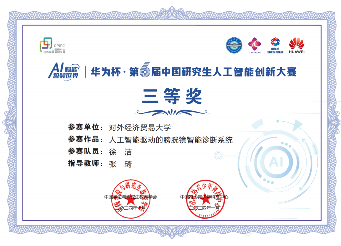 近日,由教育部学位管理与研究生教育司指导,中国学位与研究生教育学会和中国科协青少年科技中心联合主办,哈尔滨工程大学承办的“华为杯”第六届中国研究生人工智能创新大赛圆满结束。由我院张琦教授指导,2023级硕博连读研究生徐洁同学的参赛作品《人工智能驱动的膀胱镜智能诊断系统》,获得全国三等奖。