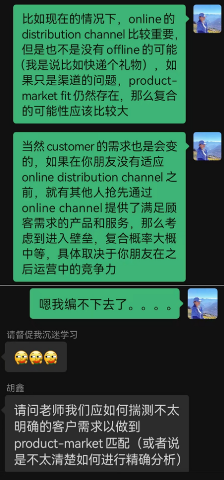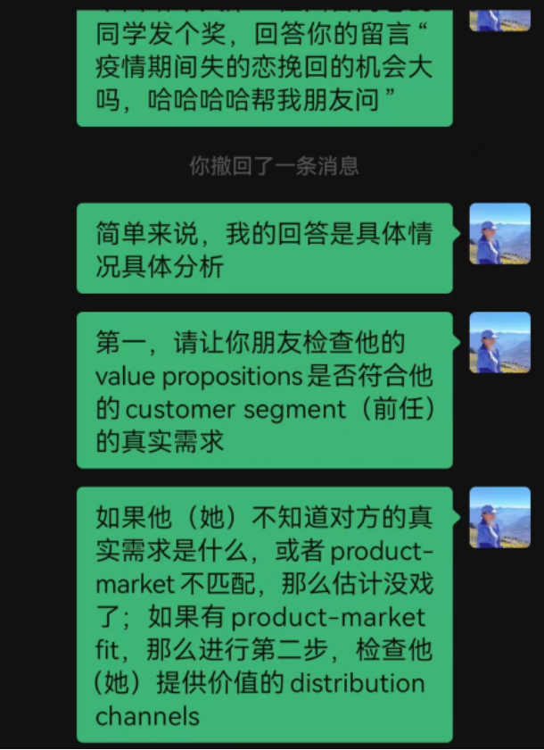其中,我印象最深的是一位学生在留言中询问:“疫情期间失的恋挽回的几率大吗,哈哈哈哈帮我朋友问”。这一看似与课程无关的问题,却巧妙地启发了我,让我看到了它与我们正在学习的商业模式知识之间的联系。我结合课程内容对这个问题进行了回答,这次意外的交流不仅成为了建立良好师生关系的基础,更激发了学生们不断将理论知识应用到实际生活中的兴趣。