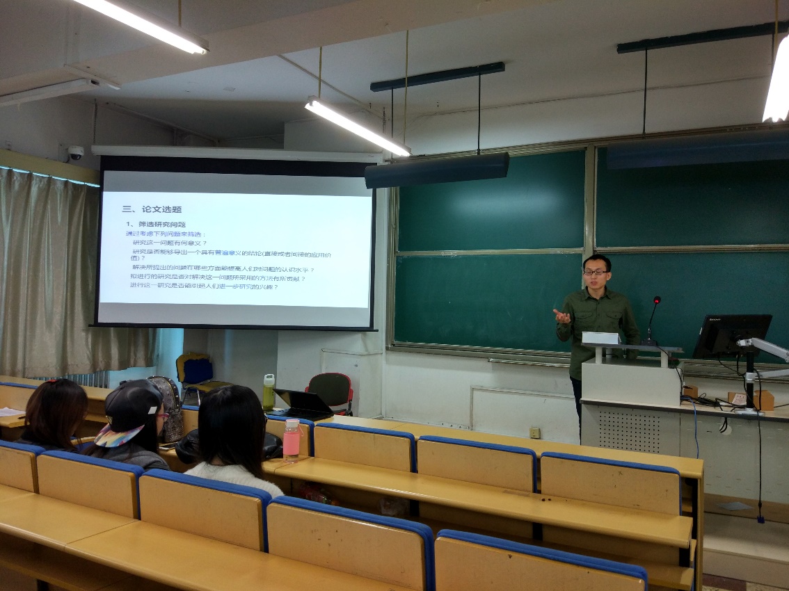 屈启兴老师在毕业论文写作规范方面为同学们进行讲解。从历年论文经常出现的问题,到研究问题的筛选,及规范化的论文写作方法做出具体的阐述。屈老师指出,毕业论文的选题要思考所研究问题的意义及贡献,正确选择研究方法,注意论文撰写的框架要求。他特别强调,同学们要具备基本的学术诚信品质,认真进行毕业论文的撰写。