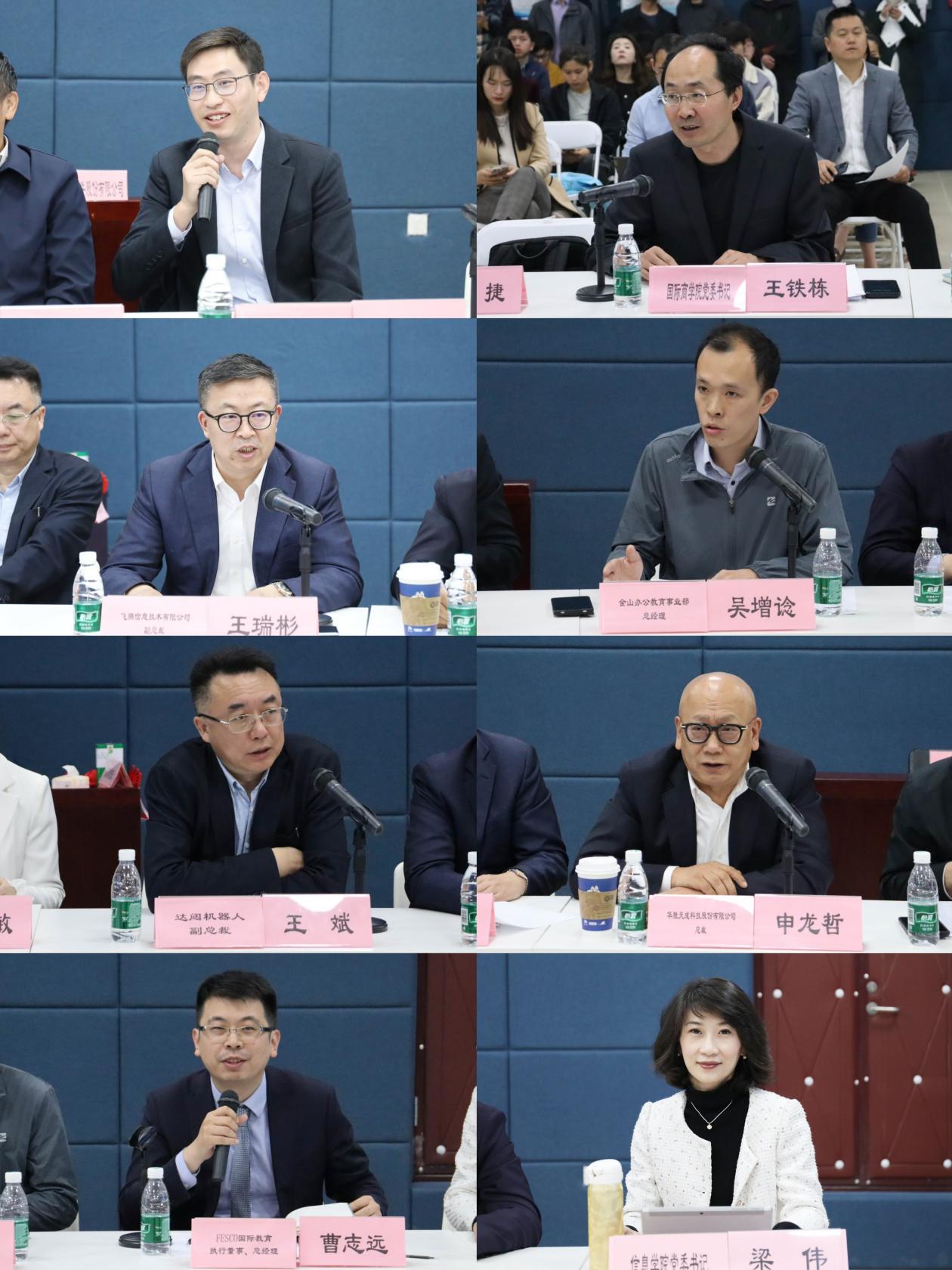 教育部高教司理工处袁楠、水果派解说 国际商学院党委书记王铁栋,以及飞腾信息技术有限公司副总裁王瑞彬、金山办公教育事业部总经理吴增谂、达闼机器人副总裁王斌、华胜天成总裁申龙哲、FESCO国际教育执行董事、总经理曹志远等政府及企业领导也相继发言。与会嘉宾对试验班的设立给予了高度评价,并对人工智能创新型人才培养新模式、以及贸大人工智能创新创业试验班的发展提出了宝贵建议。