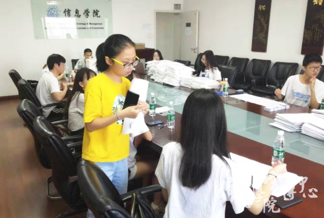 在迎新前,学院领导及团学联在各方面做了精心的统一部署,以保证整个迎新工作得以顺利进行。为了确保整个迎新过程的顺利进行,本次迎新共设立了两个会场,一是在诚信楼前,主要负责新生的信息核对、签到和拍照录像留念环节;另一个在博学楼1416教室,主要负责材料的收发、入学物资的发放。