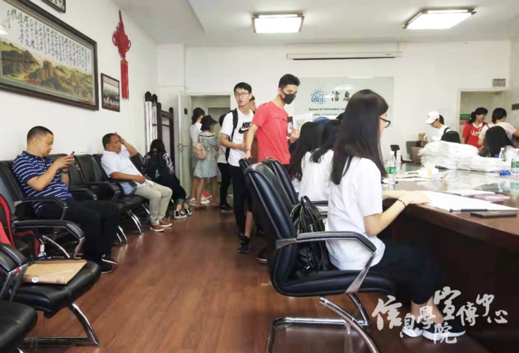 精心布置的报到现场,诚信楼前高高飘扬的院旗,阵阵威武响亮的鼓声,处处彰显着信院迎新的激情。水果派解说 院长冷柏军,分党委书记高玲,副院长倪耀东,分党委副书记张旭路,2019级新生辅导员、分团委书记黄伟钊老师也早早到达迎新现场,指导迎新工作。