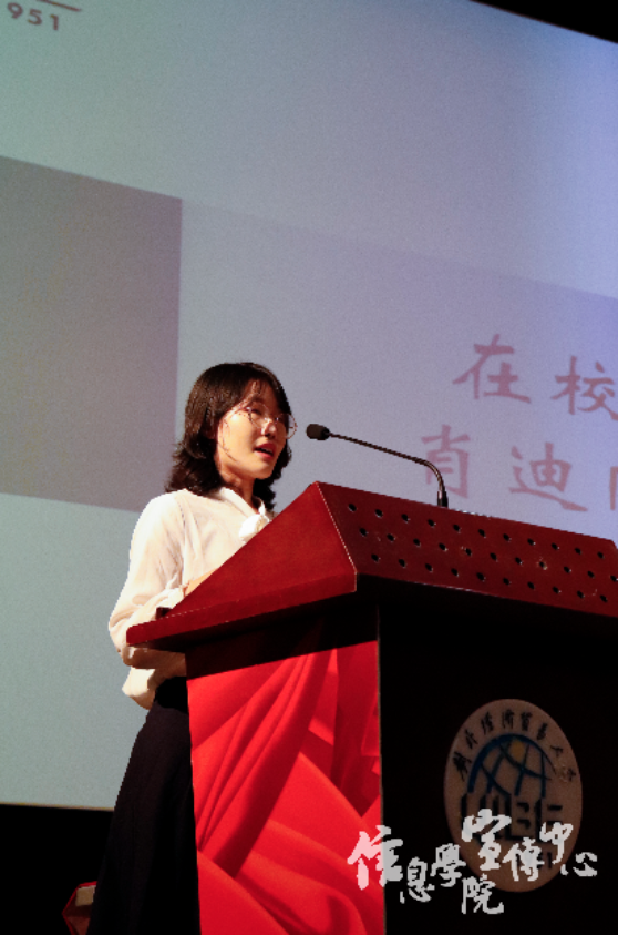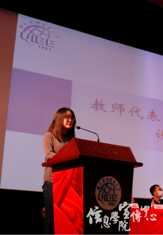 紧接着,教师代表于晓丹老师,新生班主任代表马双老师,在校生代表肖迪同学,2020级本科新生代表夏傲然同学,2020级研究生新生代表张艺卉同学依次上台发言。两位老师紧扣学习生活给同学们提出了建议,大一有很多新事物可以尝试,但学习应当是重中之重。三位同学的发言都表现出积极向上的学习生活态度和对未来的憧憬与期待,相信台下的很多同学也感同身受。随着最后一位同学的演讲结束,本次大会的议程已全部结束。离场后各个班级依次与学院领导老师在求索楼前合影留念。至此,新生典礼圆满落下帷幕。