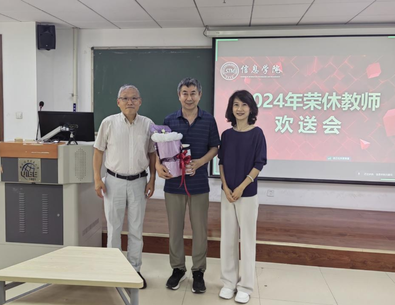 在2024年荣休教师欢送会上,首先由工会主席屈启兴为王朝培、李降龙两位退休教师致辞,并向两位老师表达真诚的感谢和祝愿。随后,院长熊璋向李降龙老师赠送鲜花和定制保温杯作为纪念,感谢李老师多年来的辛勤付出,希望李老师保持对教育热爱的温度。信管系系主任于晓丹组织信息管理系老师为两位退休教师制作了视频,一起回顾了李降龙老师与王朝培老师的教学生涯并送上美好祝愿,希望两位老师享受退休后的美好生活。王朝培老师通过远程视频参会,向大家讲述了自己的感想,感谢学院对老教师的关怀,祝愿学院发展得越来越好。