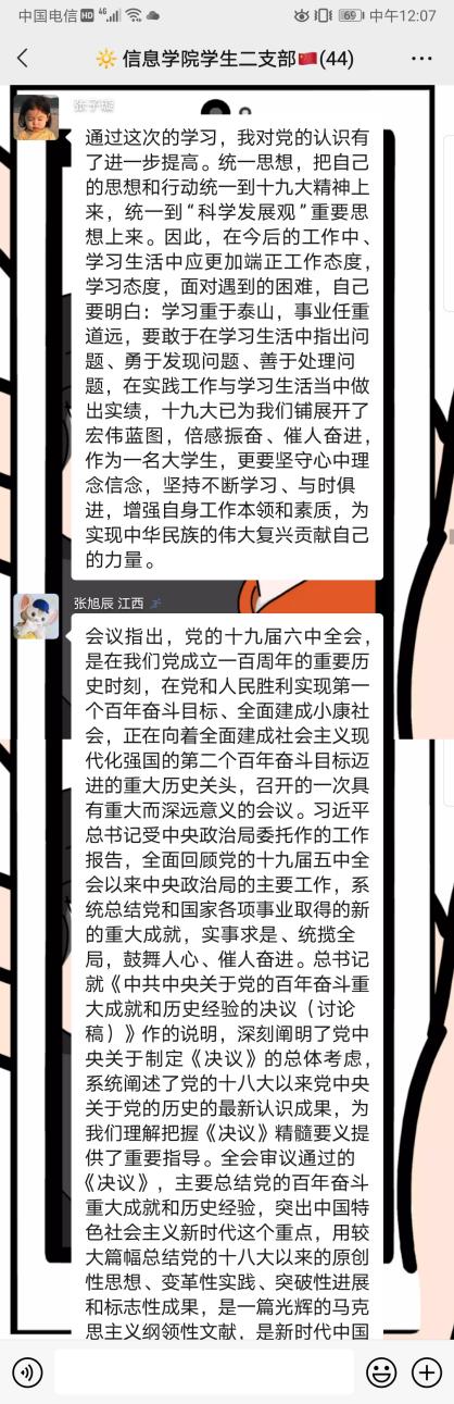 2021年11月18日晚,水果派解说 学生二支部通过微信群交流的方式召开了学习2021中国共产党第十九届中央委员会第六次全体会议的交流活动,活动由支部副书记陈家盈同志主持,二支部所有成员共同参与,二支部成员充分交流了各自的感想和心得,感悟到了会议精神,会议取得了圆满的效果。