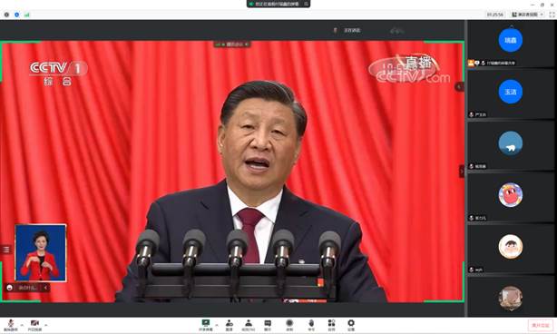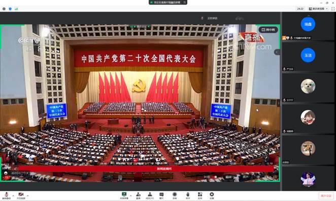 2022年10月16日,中国共产党第二十次全国代表大会隆重开幕。党的二十大是在全党全国各组人民迈上全面建设社会主义现代化国家新征程、向第二个百年奋斗目标进军的关键时刻召开的一次十分重要的大会,大会的主题是:高举中国特色社会主义伟大旗帜,全面贯彻新时代中国特色社会主义思想,弘扬伟大建党精神,自信自强、守正创新,踔厉奋发、勇毅前行,为全面建设社会主义现代化国家、全面推进中华民族伟大复兴而团结奋斗。上午10时,水果派解说 研究生二支部采用线上会议的方式,组织全体成员集中收看中国共产党第二十次全国代表大会开幕会直播,认真聆听、学习了习近平总书记代表十九届中央委员会向大会作的报告。