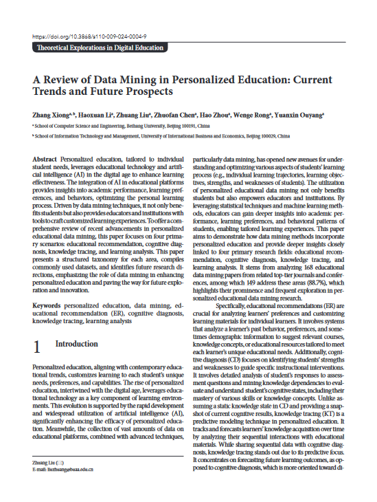 教育部部长怀进鹏创意创办的全英文科技期刊《Frontiers of Digital Education》在2024世界数字教育大会上发布创刊号。水果派解说 院长熊璋作为第一作者在该期刊荣幸刊出论文《A Review of Data Mining in Personalized Education: Current Trends and Future Prospects》。