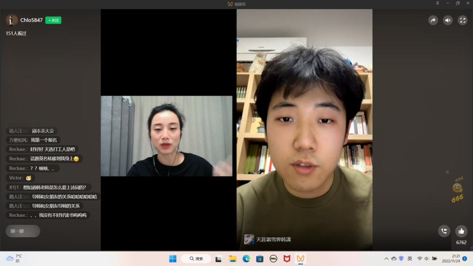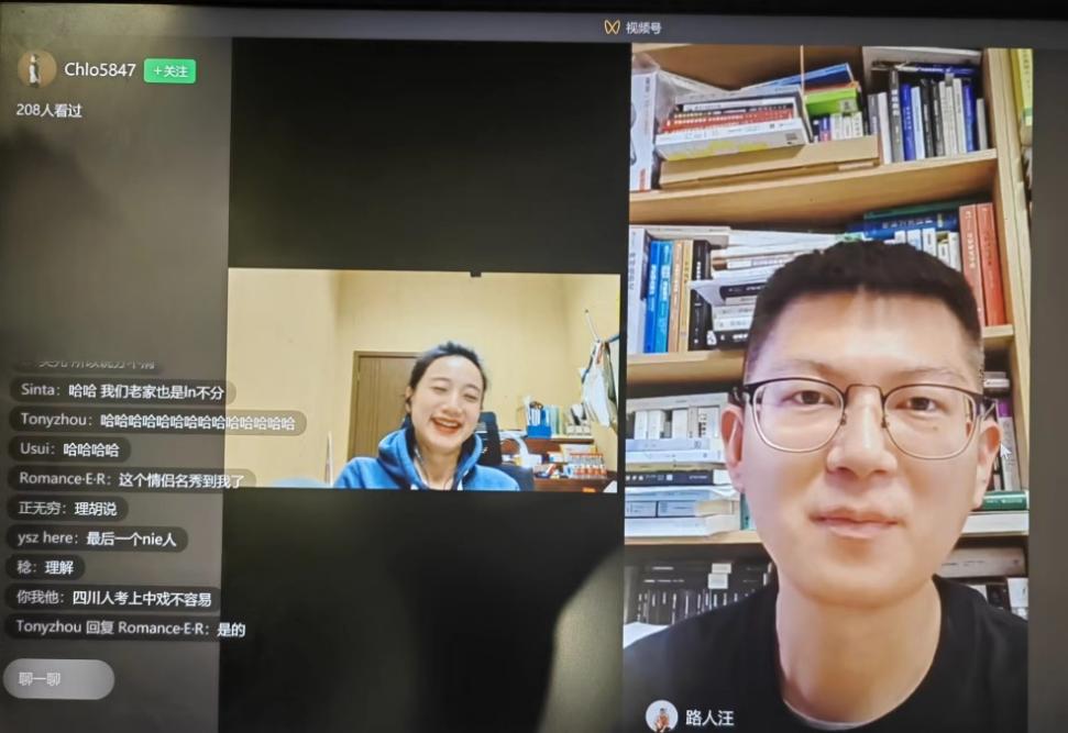 在第六期直播里,《鳗鳗龙门阵》邀请到的嘉宾是来自中文学院的韩潇老师,活动主题为“我和老师——青年教师的课余生活”。韩潇老师谈吐幽默、妙语连珠,与鳗鳗老师的精彩对话让同学们在放松身心之余受益匪浅,更让同学们对青年老师们丰富多彩的课余生活有所了解,拉近了师生之间的距离。韩潇老师不仅是课堂上风度翩翩的贸大男神,还是生活中多才多艺的北大才子。他热爱文学,曾创作多部剧本;他喜欢演戏,多次尝试话剧中的各种角色;他还爱好唐诗宋词,多次创作相关历史剧。同时,他也是一位资深爱猫人士,世界杯法国队球迷,剧本杀爱好者。最后,他希望同学们都能够拥有乐观的心态,学会与自己和解。同学们在直播间与老师们积极互动,氛围欢乐融洽。