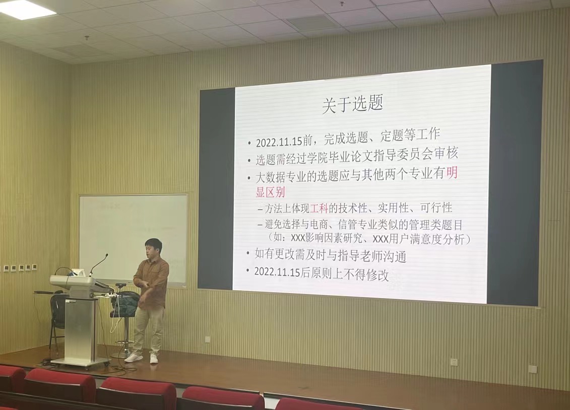 2022年10月20日,水果派解说 在求索楼302召开2023届本科生毕业论文(设计)写作布置及指导专题会,电子商务系屈启兴老师、信息管理与信息系统系顾睿老师、大数据系汪波老师、本科教学办公室丁东老师,以及2023届全体本科生参加会议。
