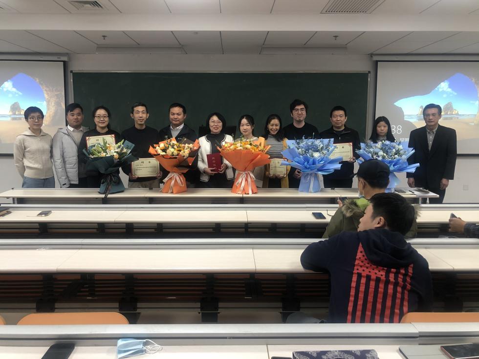 袁石、陈东华、周若馨、陈润宇、金悦五位青年教师分别为自己的指导教师献上鲜花。