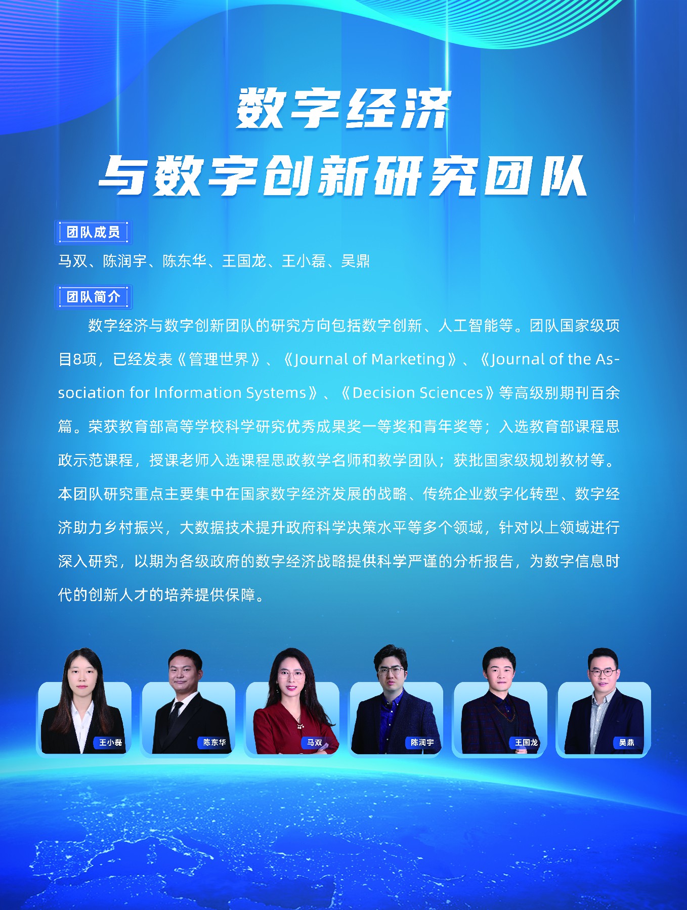 数字经济与数字创新团队的研究方向包括数字创新、人工智能等。团队国家级项目8项,已经发表《管理世界》、《Journal of Marketing》、《Journal of the Association for Information Systems》、《Decision Sciences》等高级别期刊百余篇。荣获教育部高等学校科学研究优秀成果奖一等奖和青年奖等;入选教育部课程思政示范课程,授课老师入选课程思政教学名师和教学团队;获批国家级规划教材等。本团队研究重点主要集中在国家数字经济发展的战略、传统企业数字化转型、数字经济助力乡村振兴,大数据技术提升政府科学决策水平等多个领域,针对以上领域进行深入研究,以期为各级政府的数字经济战略提供科学严谨的分析报告,为数字信息时代的创新人才的培养提供保障。